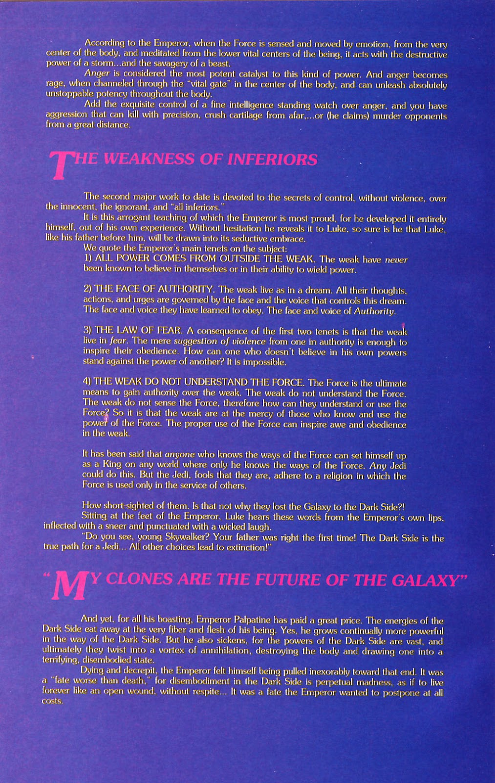 The second issue is that the story in and of itself was planned and written before the writers of the EU had a focus on continuity in their stories. Because of this, there wouldn’t have been a mandate of continuity in terms of what happens in the story itself, and other writers were allowed to make changes to the timeline of said events of Dark Empire because of this. Tom Veitch is not the Word of God in regard to Legends continuity as that falls to Leland Chee, the Keeper of the Holocron. To be clear, Tom does have authority to clarify elements of his story, but his statements made years after Dark Empire released not only contradict the story, but several other statements that Palpatine can use the ability of his own will.